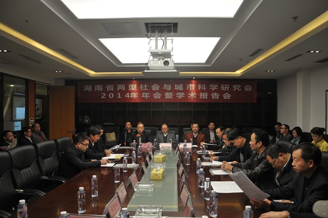 湖南省两型社会与城市科学研究会会长赵运林、湖南省科协副主席廖任强分别作了2014年度工作报告和讲话。
