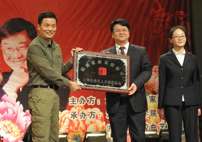 周卫星在湖南省曲艺家协会向好博·(中国)手机网页版授予“大学生曲艺人才培养基地”的仪式上说:“我们希望能发现优秀曲艺人才,认真合作,着力培养,为发展湖南曲艺事业,弘扬优秀传统文化做出贡献。”汤放华和学生代表马丹丹等代表学校接受牌匾,我校由此开始成为了省曲协的人才培养基地。