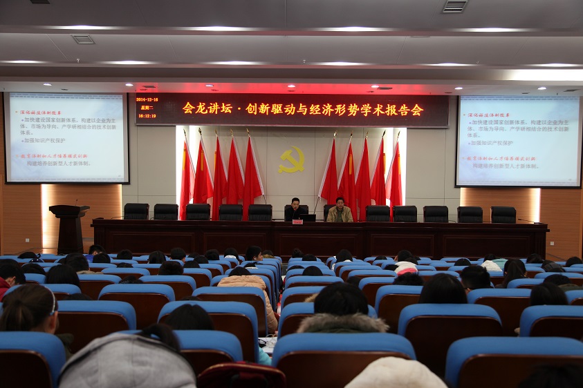 (本网讯) 1216日下午 ,会龙讲坛在逸夫图书馆报告厅举行,副校长刘辉煌为师生做了题为“经济新常态下的创新驱动与经济发展”的学术报告。商学院、市测院、通电院、文学院等院系的300余名师生聆听讲座。讲座由宣传统战部主办。