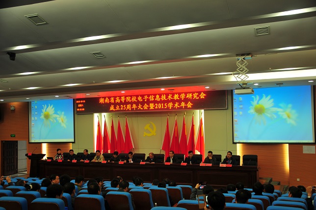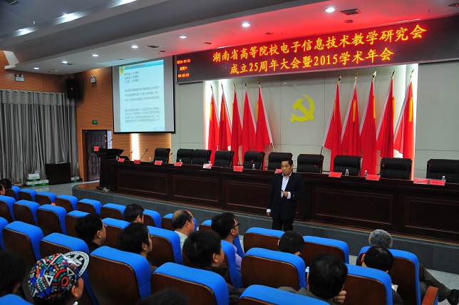(本网讯) 1031上午,湖南省高校电子信息技术教学研究会成立25周年纪念大会暨2015年学术年会我校图书馆报告厅召开。党委副书记、副校长孟昭武出席会议,来自省内28所高校的100余名老师和相关企业代表与会。大会由学会副理事长施荣华主持。