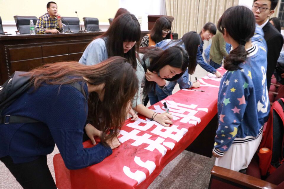讲座结束后,现场师生在“诚己、诚人、诚群”的横幅上签名,郑重承诺,要从自身做起,努力学习,杜绝考试不诚信行为。