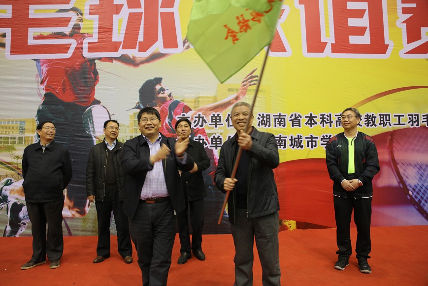 随后,我校党委书记罗成翼将湖南省本科高校教职工羽毛球协会会旗交接给下一届承办单湖南财政经济学院副校长樊晓平手中。