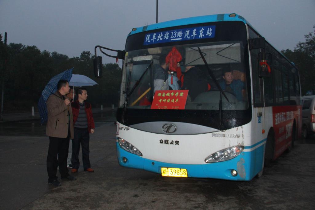 (本网讯)12月24日清晨,学校北门12辆送考车整齐排列。一年一度地全国硕士研究生考试正式开启,学生工作处、二级学院学生工作负责人早早迎候在这里,送奋战了一年的城院学子赴益阳师范考点参加考试。