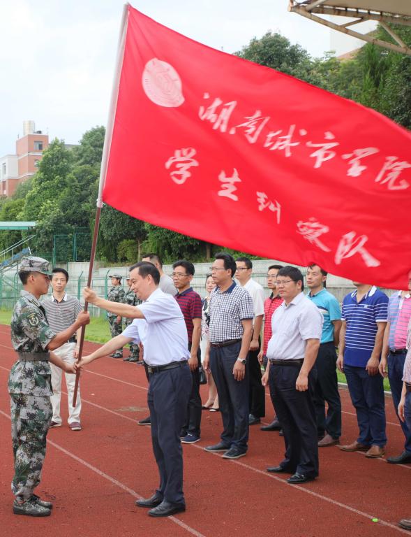仪式上,罗成翼和雷存喜代表学校分别向军训教导队、民兵预备役分队和学生纠察队进行了授旗。