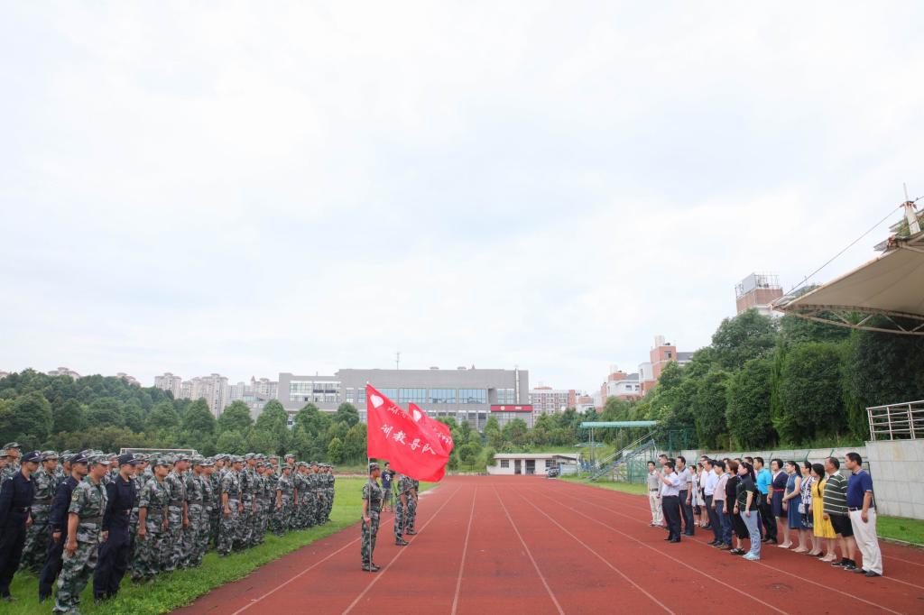 (本网讯)7月5日清晨,我校学生教官集训队授旗仪式在校田径场举行。党委书记罗成翼、副校长雷存喜,宣传部、教务处、学生工作处、团委负责人,各二级学院党委(党总支)副书记以及104名学生教官集训队队员参加了授旗仪式。