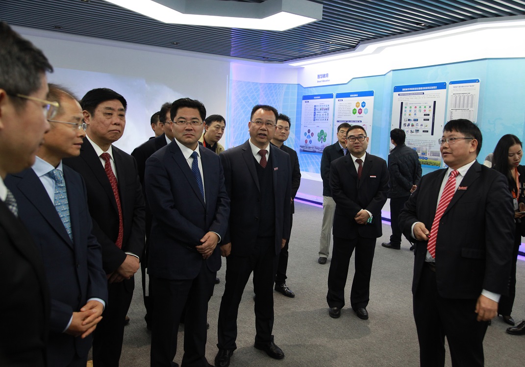 党委书记罗成翼向张峰、隋忠诚、徐直军一行介绍学校改革发展成果