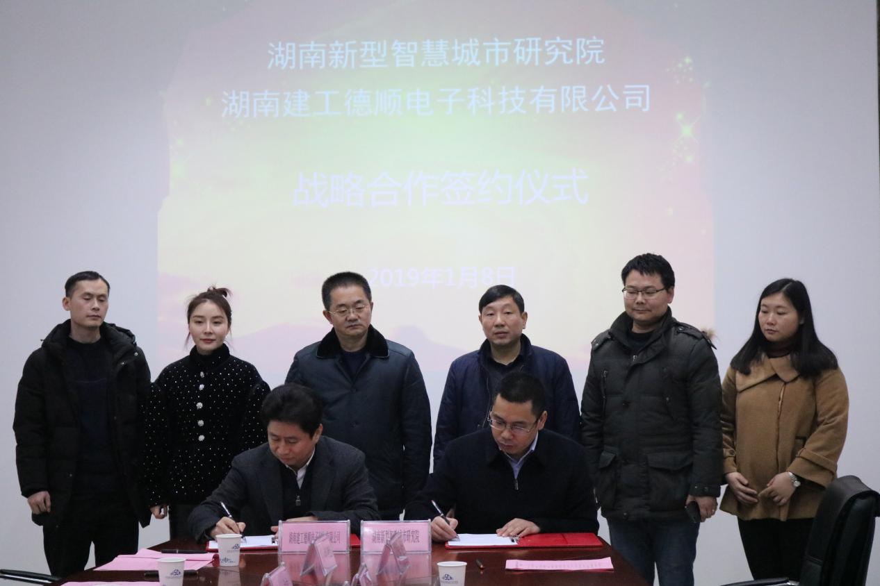 (本网讯)2019年1月8日下午,我校与湖南建工德顺电子科技有限公司(以下简称建工德顺)战略合作协议签约仪式在创新创业楼二楼会议室举行。省建工集团党委副书记陈克军、建工德顺董事长谢建华及部分公司高管,副校长谭献良、智慧城市研究院相关负责人出席签约仪式。签约仪式由智慧城市研究院院长李梦醒主持。