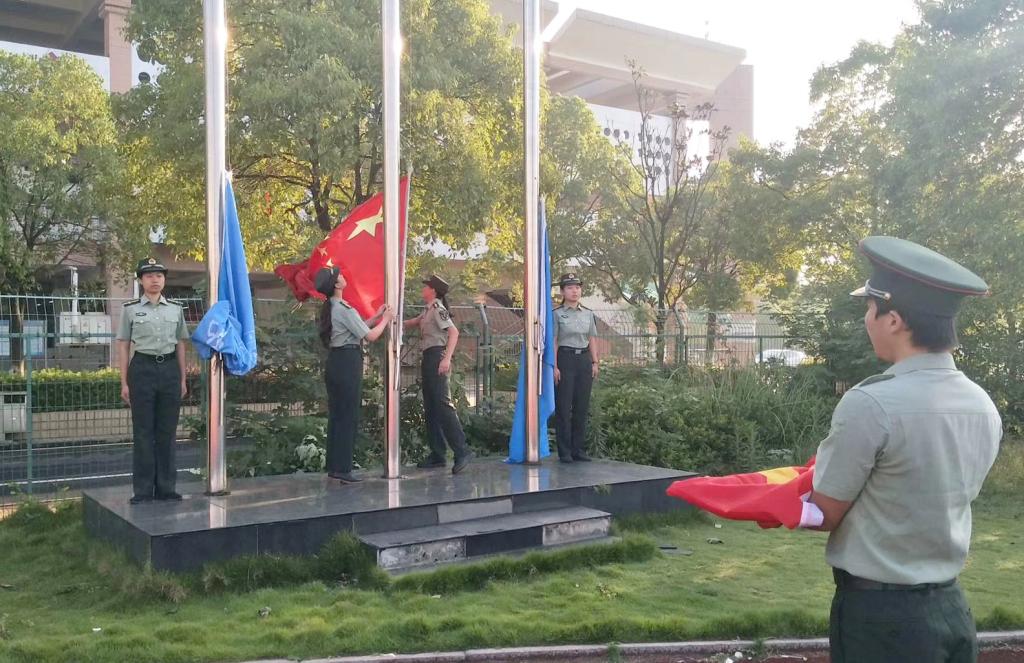 迎着朝阳,我校国旗护卫队列着整齐的队伍、迈着有力的步伐走向升旗台,五星红旗在雄壮的国歌声中徐徐升起。庄严的升国旗仪式后,进行了奏校歌、升校旗的环节。