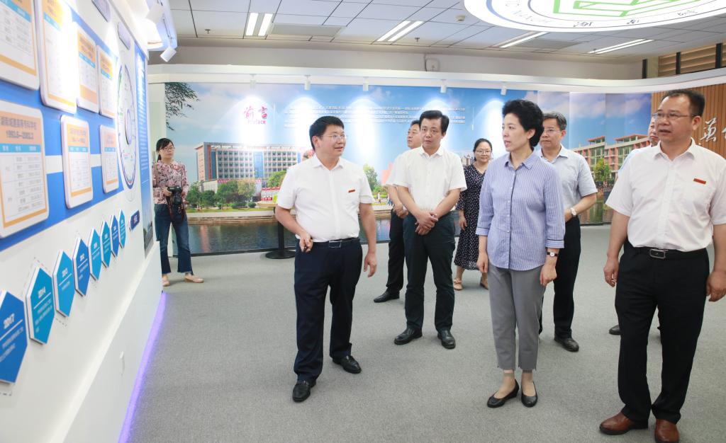 乌兰一行首先来到我校办学成就展览馆。党委书记罗成翼对我校升本以来的办学成就、近年来破立并举改革发展情况,尤其是学校党建工作、“三全育人”工作特色亮点做了详细介绍。罗成翼说,2016年以来,学校实行“一二三五”发展战略,推进“六破六立”综合改革,以大改革促进大发展。学校应用型人才培养特色鲜明,师资队伍建设成效显著,教风学风明显改善,各项关键性可比核心指标明显进位,并构建班子四力、干部六(八)条、基层党建“二三五”工程、学生思想政治六进等符合学校实际的党建话语体系,综合实力进入同类学院第一方阵。