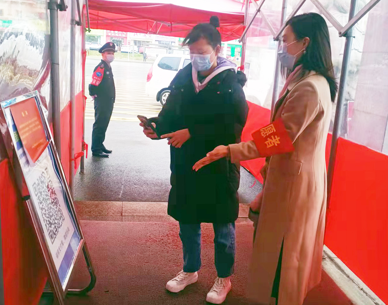 教师党员志愿者引导师生扫场所码。