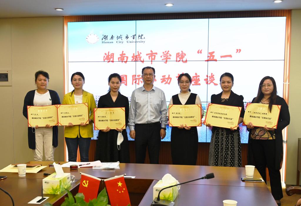 李建奇为湖南省三八红旗集体——马克思主义基本原理概论教研室、2021年校级“芙蓉标兵岗”——《城市学刊》编辑部与图书馆读者服务部及张闻芳等5名校级“芙蓉百岗明星”颁发了荣誉证书。