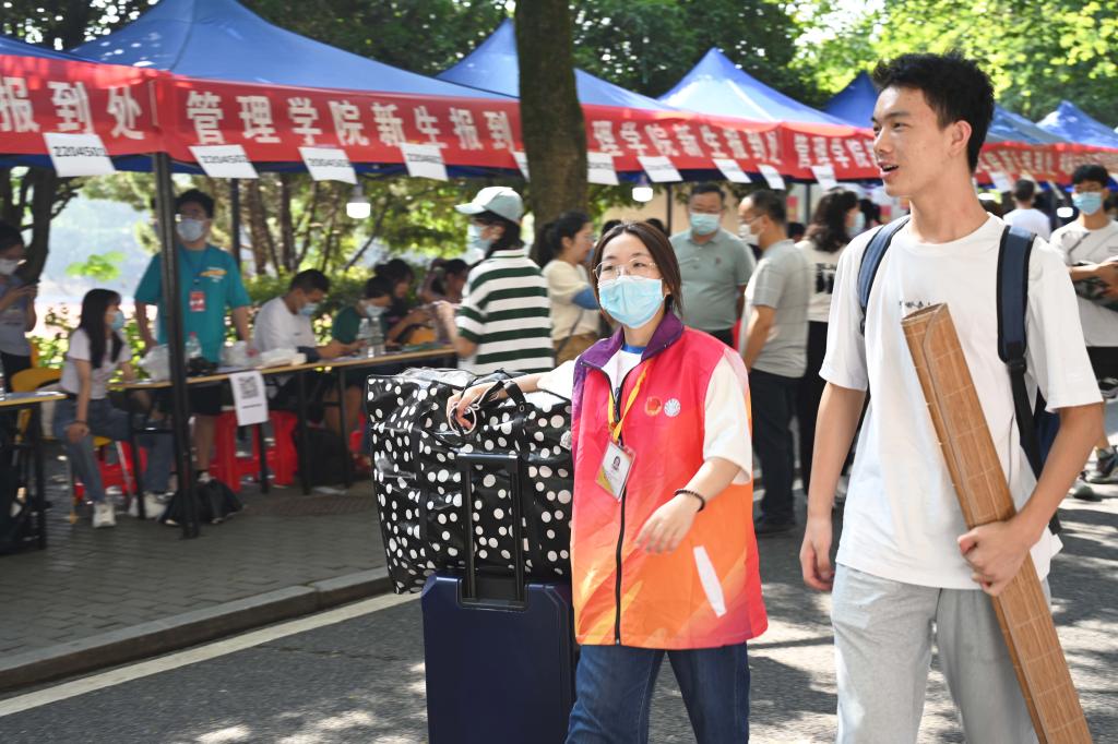 早上8点不到,学校校门口就已是人潮涌动。扫场所码、测量体温、查验健康码行程码、出示48小时内核酸检测阴性证明和录取通知书……在学校东、南、西、北四个校门处,“新橙子”们间隔1米排着长队,从临时搭建的报到通道中依次进入校园,并在志愿者的引导和帮助下前往迎新报到处。