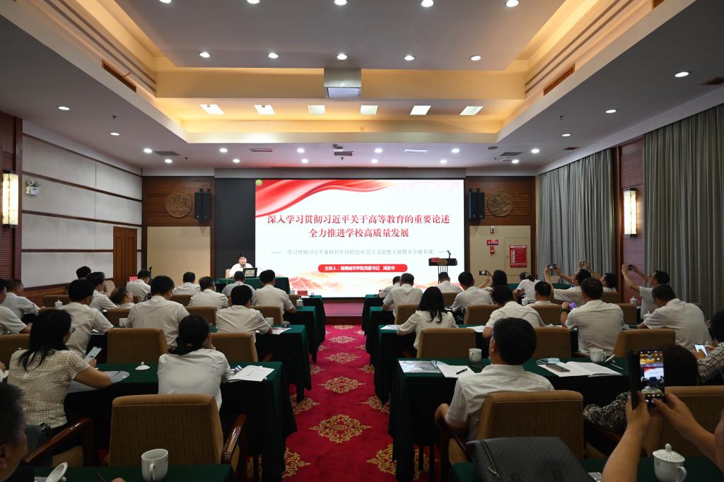 下午,全体成员在韶山宾馆会议室进行了“以学增智”专题学习研讨。汤放华以《深入学习贯彻习近平关于高等教育的重要论述 全力推进学校高质量发展》为题,为大家上了一堂深刻的党课。汤放华紧密结合当前高等教育新形势和学校发展新情况,通过详实的数据对比、丰富的案例讲解,从领会精神、再学习再思考习近平总书记关于教育重要论述,审时度势、切实增强教育强国的责任感使命感和紧迫感,狠抓落实、谱写新时代新征程好博·(中国)手机网页版高质量发展新篇章三个方面,阐述了学习贯彻习近平总书记关于教育的重要论述我们要做什么、怎么做的问题。