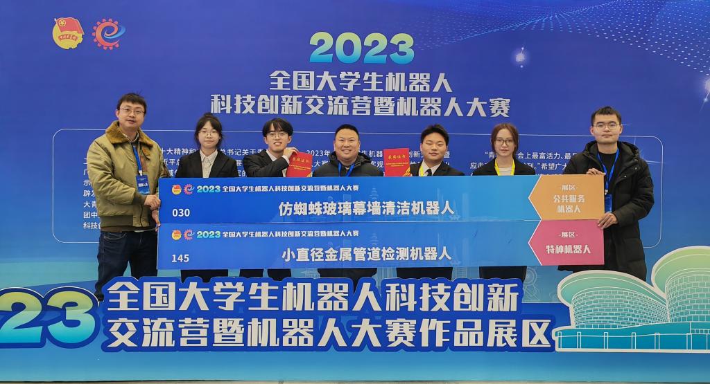 本网讯(通讯员 孔军)12月18—19日,2023年全国大学生机器人科技创新交流营暨机器人大赛在山东日照国际展览中心举行。我校“仿蜘蛛玻璃幕墙清洁机器人”“小直径金属管道检测机器人”两件作品以优异的路演表现,获得中科院院士毛明领衔的评审委员会认可,分别获得大赛特等奖和二等奖,实现我校在该项赛事特等奖的突破。共青团中央书记处常务书记、全国青联主席徐晓,山东省人大常委会副主任王随莲,中国科学院院士、大赛评审委员会主任毛明等出席颁奖仪式,并为获奖团队颁奖。