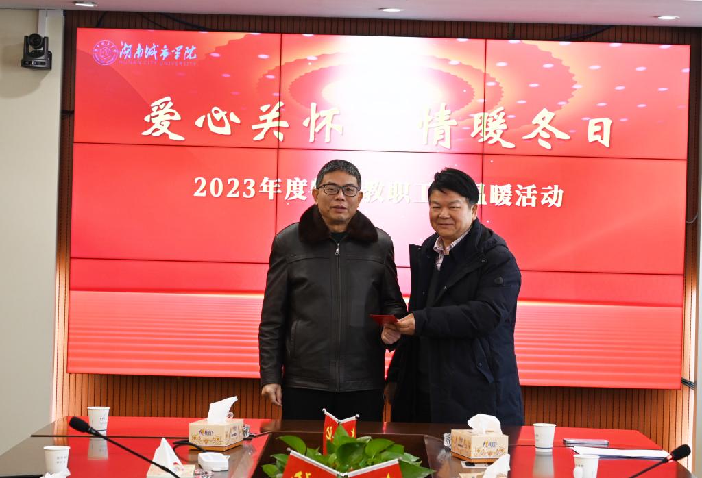 本网讯(通讯员 周敏)爱心关怀,情暖冬日。1月23日上午,学校在办公楼一会议室开展2023年度为困难教职工送温暖活动。校党委书记汤放华,校长何振出席,困难教职工代表及工会全体人员参加。活动由副校长谭献良主持。