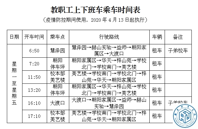 一、4月13日起,全体管理人员正式上班,开通上下班交通车和教职工子弟上学接送车(具体乘车时间及路线附后)。根据疫情防控要求,采取分散用餐方式,各单位于每天上午9点30以前可以向教工食堂(联系人:汤经理,13574712155)报中餐人数,中午11点30分~12点30分各单位派人去教工食堂按实际报餐人数刷卡取餐。