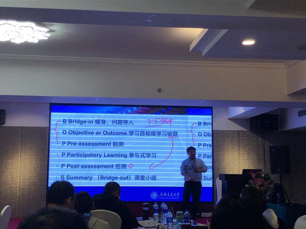 本次培训以“工作坊”形式开展,包括理论讲解、分组课程设计、课程案例分享、现场实践指导等环节,主要内容包括金课的教学设计、线上金课的课程视频设计、线上线下混合金课的教学模式、金课案例分享等。本次培训由上海交通大学教务处在线课程负责人、上海交通大学首批慕课课程建设推进办公室负责人余建波教授主讲,其为参加培训班老师分享了在线课程建设、混合式教学金课建设等方面的丰富实践经验。