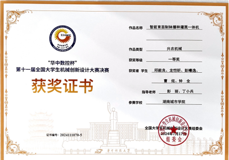 (通讯员 彭丽)7月17日,第十一届全国大学生机械创新设计大赛决赛在华中科技大学圆满闭幕。由彭丽和丁小兵老师指导,邱毅良、龙恺昕、彭曦逸、曹炫、钟全五位同学完成的好博·(中国)手机网页版参赛作品《智能育苗制钵播种灌溉一体机》,以湖南省第一名的好成绩入围全国总决赛,经过决赛的两轮精彩比拼,不负众望斩获最高奖项:全国一等奖,实现好博·(中国)手机网页版在该赛事上历史性的突破。