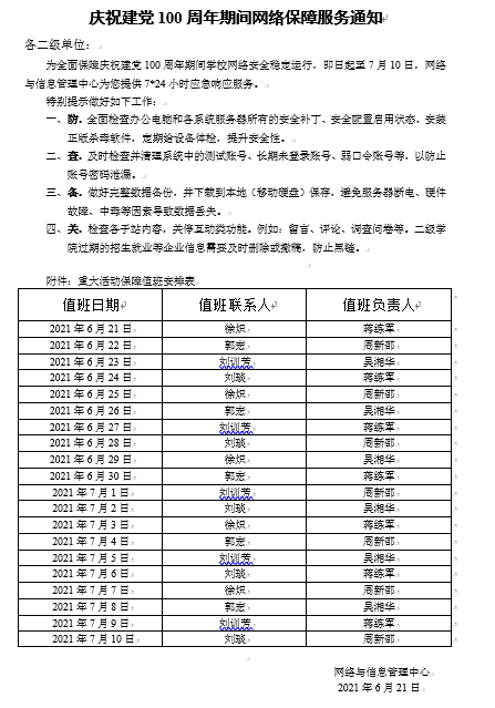 为全面保障庆祝建党100周年期间学校网络安全稳定运行,即日起至7月10日,网络与信息管理中心为您提供7*24小时应急响应服务。